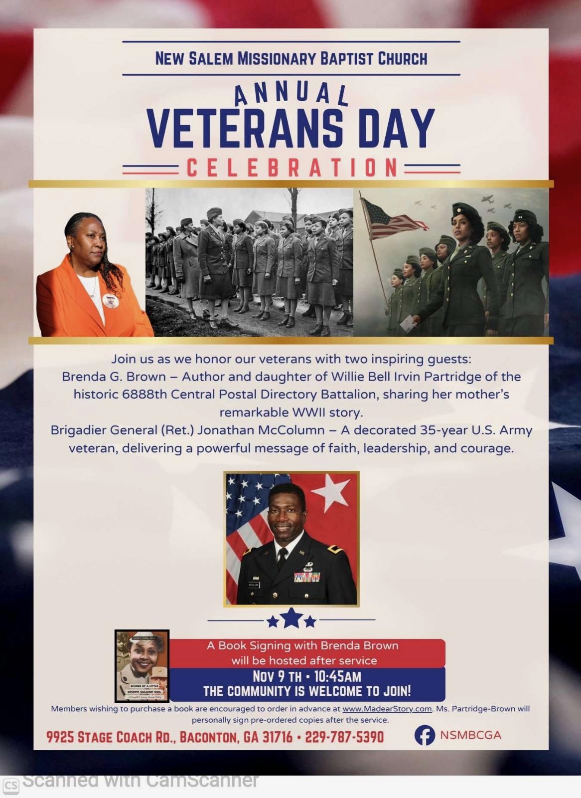 The event took place at the New Salem Missionary Baptist Church in Baconton, Ga on November 10, 2024 at 11AM. The Veterans Day Message was presented by Jonathan McColumn.